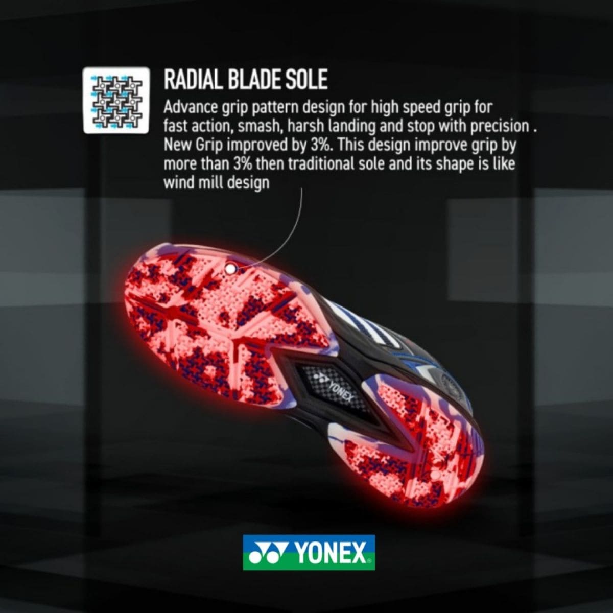 RADIAL BLADE SOLE: Phần đế cao su của đôi giày cầu lông Yonex 65Z3 chuyển từ ROUND SOLE thành RADIAL BLADE SOLE. Bằng cách sắp xếp tinh vi hình “ngôi sao Ninja” kết hợp các khu vực có vết lõm lớn và nhỏ, trọng lượng của giày được phân tán và độ bám sân được cải thiện khoảng 3% hỗ trợ cho các bước chạy lướt và dừng đột ngột nhất là trong các pha cầu bị đối thủ đẩy 2 nhịp.