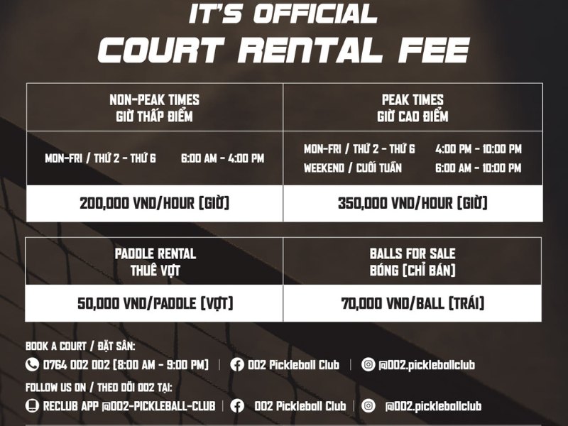 - Giá thuê sân: Giá thuê sân Pickleball 002 phù hợp với nhiều đối tượng, với các mức giá đa dạng tùy vào khung giờ và ngày trong tuần.