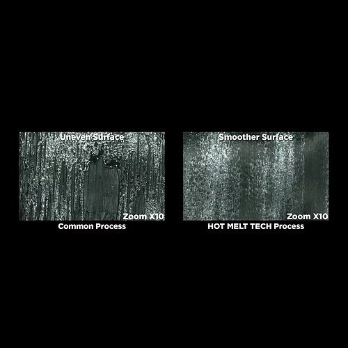 Công nghệ HOT MELT TECH Các tấm than chì HOT MELT TECH được nung ở nhiệt độ cao hơn để tiếp tục loại bỏ các tạp chất trong quá trình sản xuất ban đầu. Điều này dẫn đến một lớp phủ mượt mà hơn, nhất quán hơn, không chỉ tăng cường sức mạnh cho khung mà còn tăng cường tính khí động học của than chì, do đó làm tăng vận tốc của vợt.